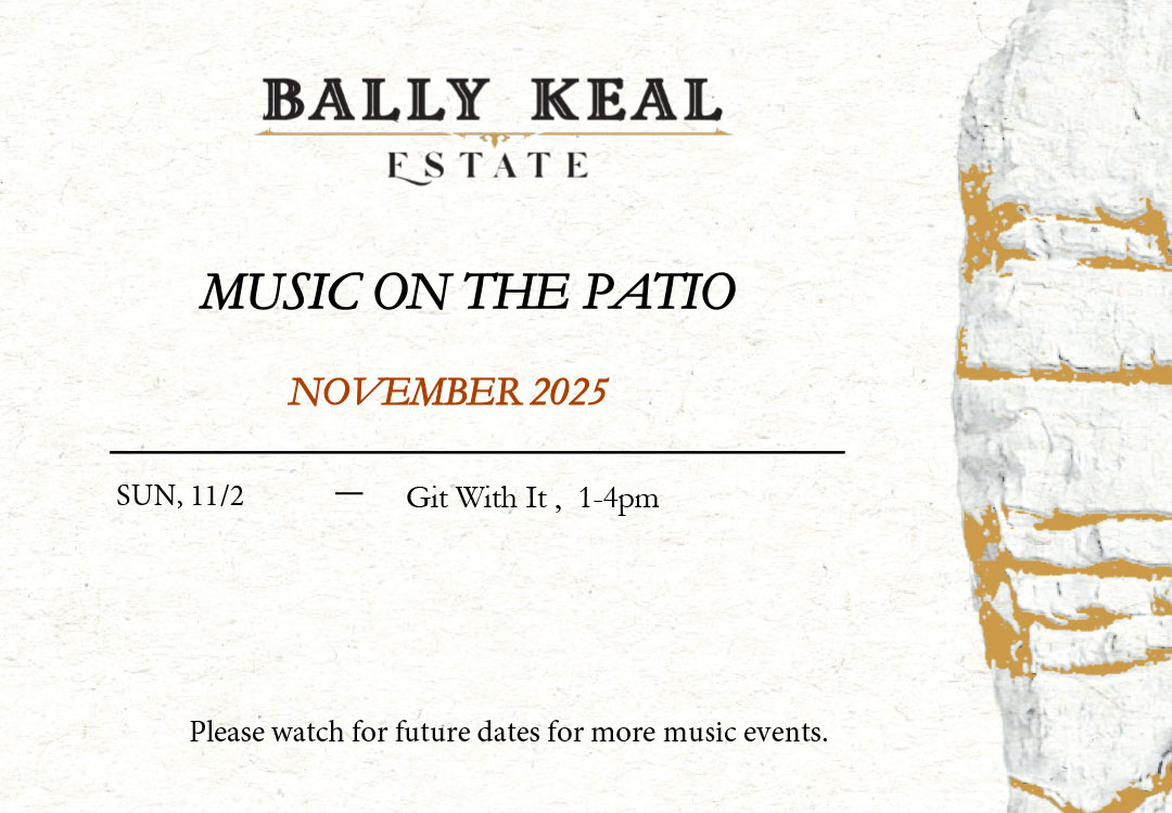 Join us on Sunday, November 2nd 1:00 - 4:00 pm At the Bally Keal Estate Tasting Room Come out while the weather is still cooperating and enjoy the music from: Git With It Put on your dancing shoes. No admission fee Food Truck on site: Dogfather * NO […] |